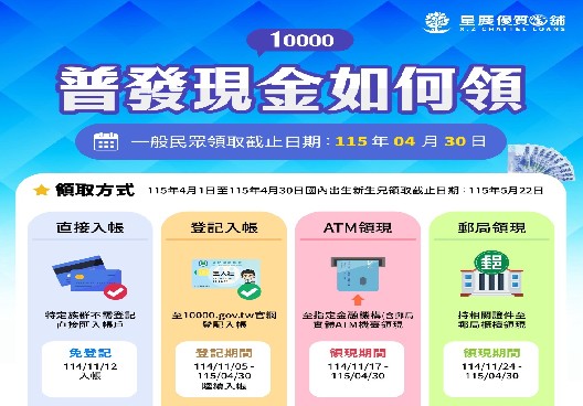 你們想怎麼運用普發呢 不用抽、不用搶,人人都有1萬元! 四種領取方式任你選,最晚115年4月……more